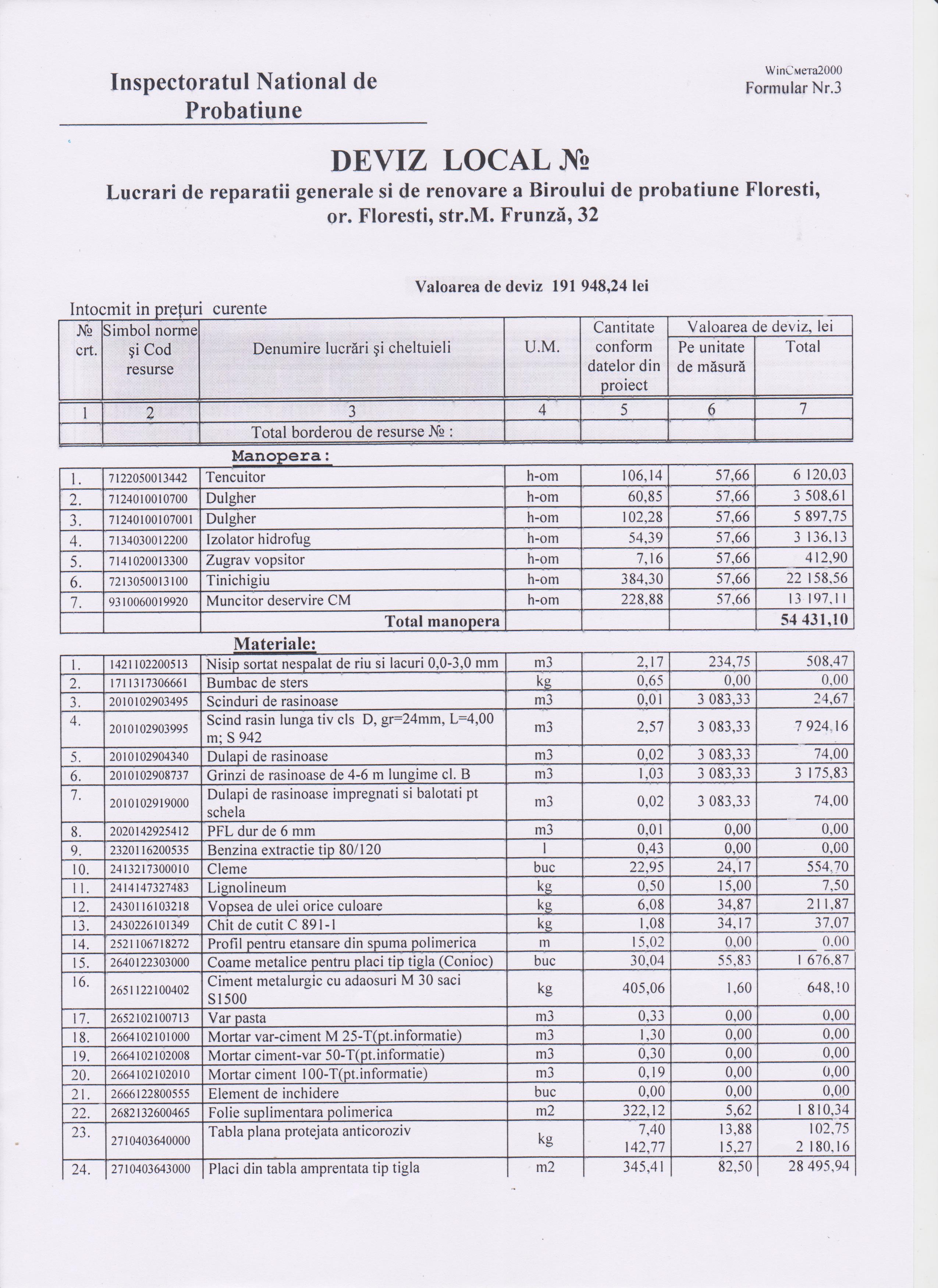 Lucrări de reparații generale și de renovare a Biroului de probațiune Florești, or. Florești, str. Frunză, 32