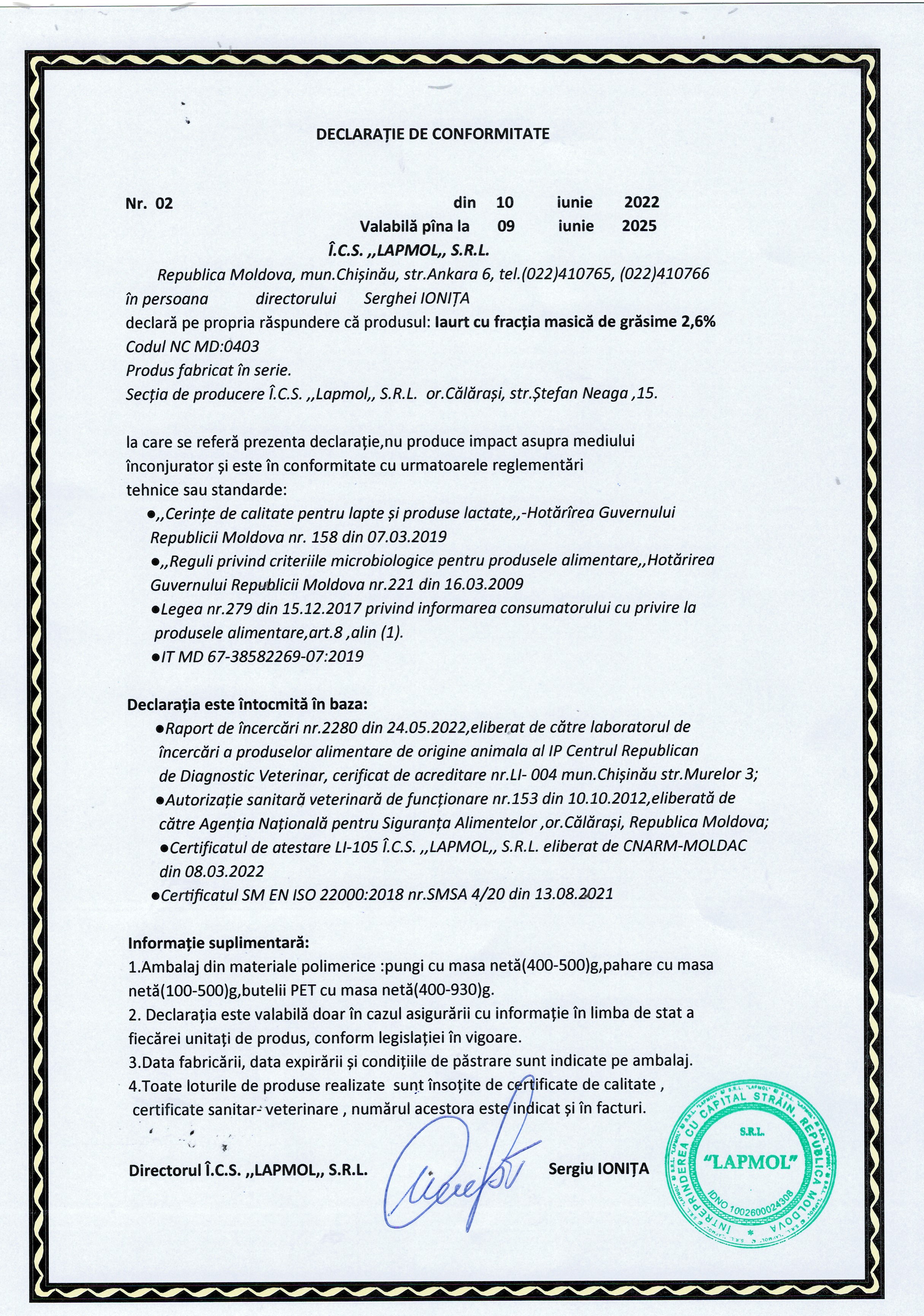 Acte ce denota calitatea produsului: certificat de conformitate/ declarație de conformitate; Certificat sanitar-veterinar; certificate de calitate