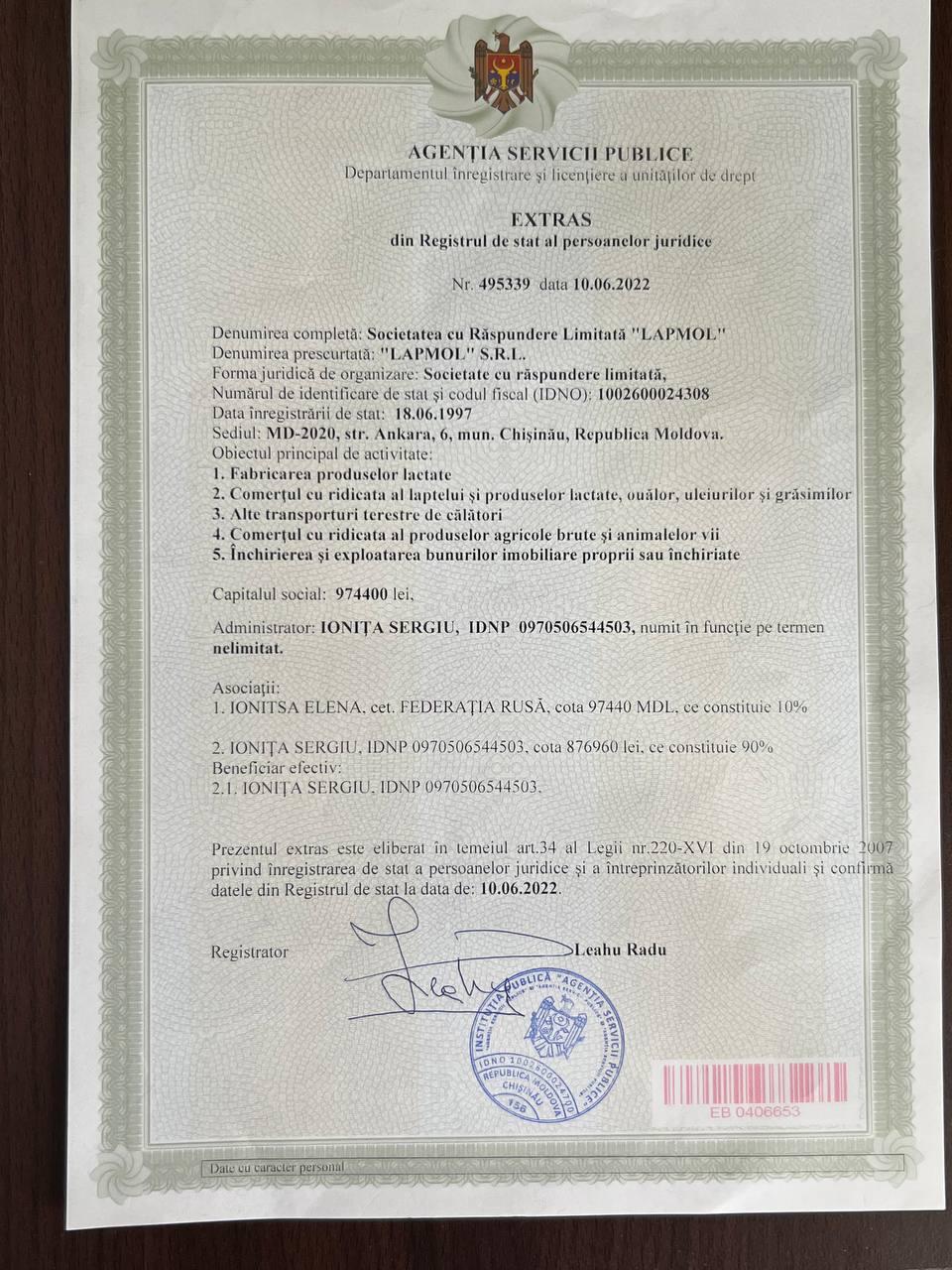 Acte ce denota calitatea produsului: certificat de conformitate/ declarație de conformitate; Certificat sanitar-veterinar; certificate de calitate