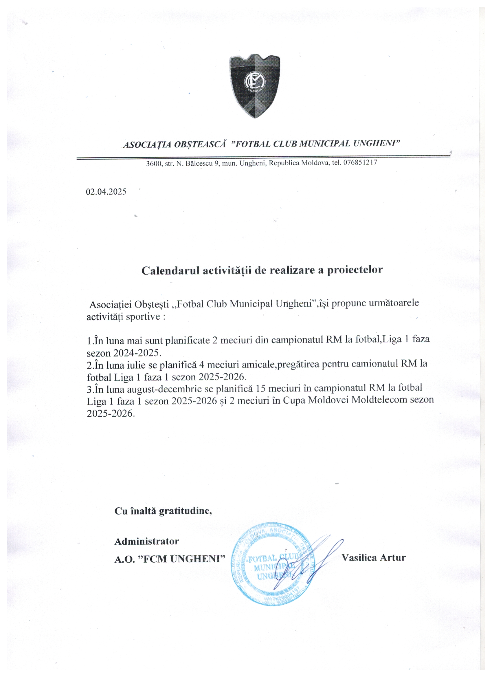 2. Organizarea antrenamentelor, precum și participarea echipei la Campionatul de Fotbal al RM, Divizia A, pe parcursul anului 2025.