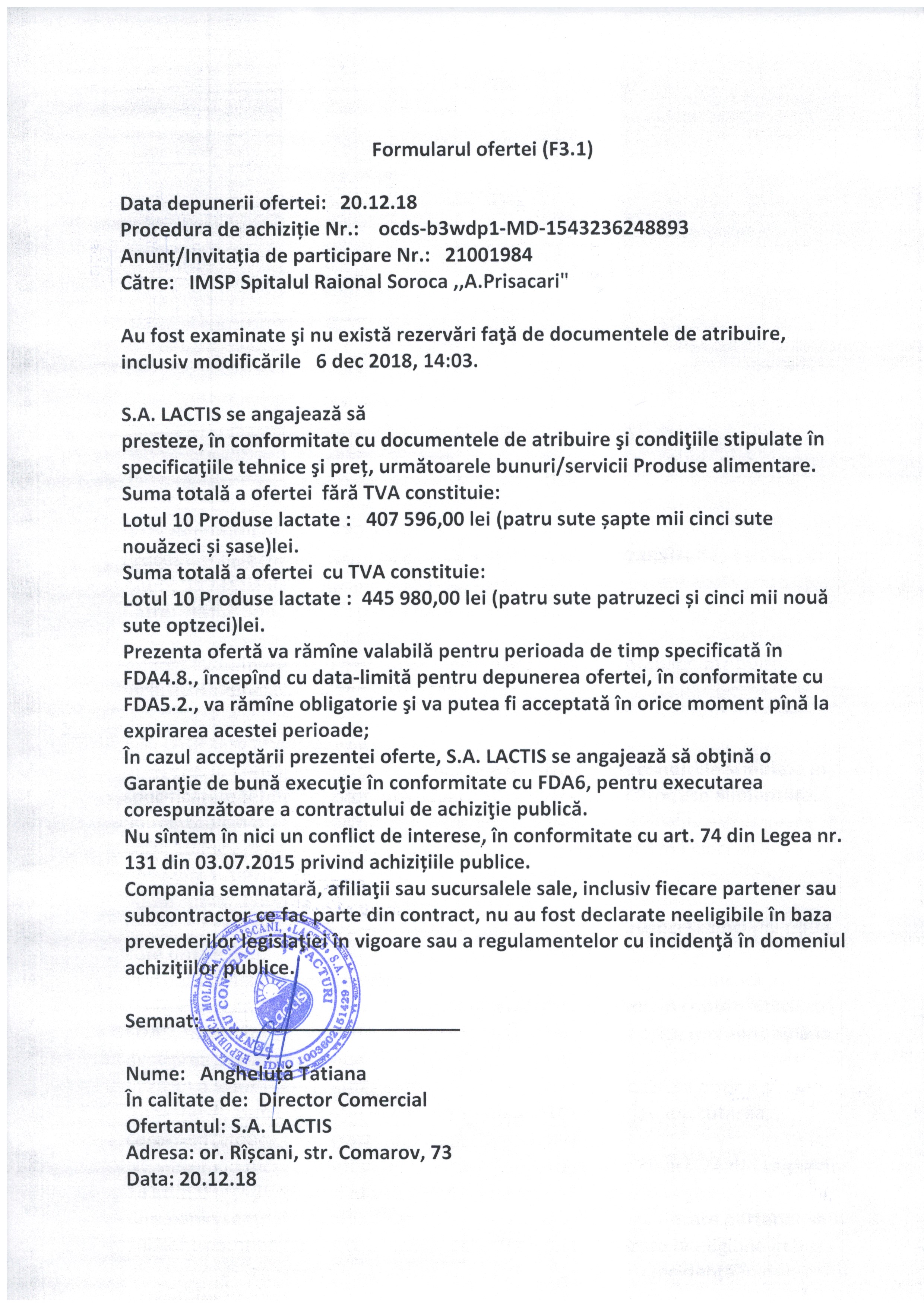 Причина: Decizia de atribuire a contractului de achiziţii publice Nr.2 din 04.01.2019