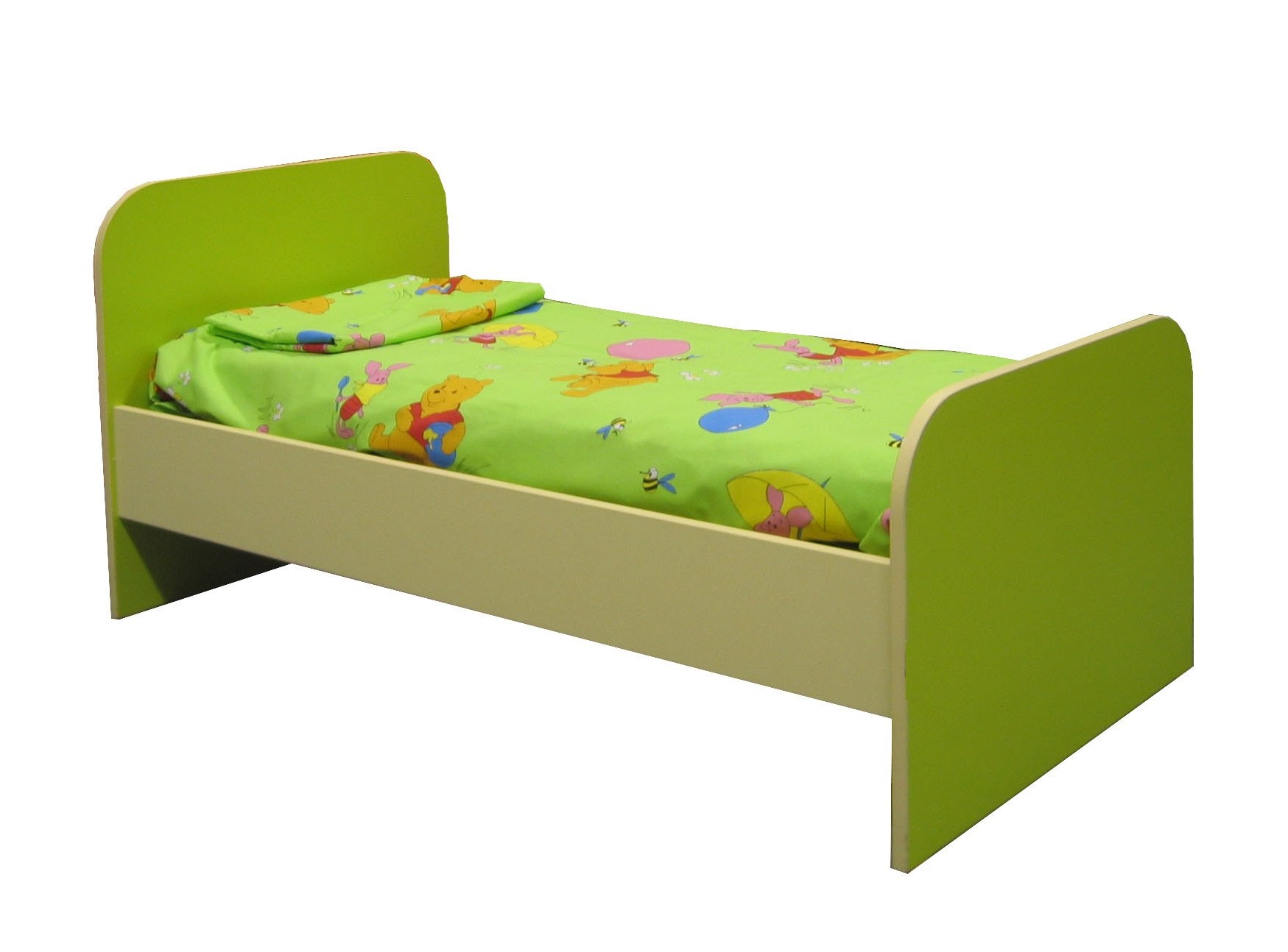 Кровать детская с округлыми спинками (размеры: 1436*636*615мм; материал – ДСП ламинированная, толщина – 16мм; фасад оклеен кромковой лентой ПВХ – 1мм; боковины скруглены; внутреннее наполнение – фанера 7мм; цвета- салатовые спинки, оранжевые боковинки). Матрас ватный (60*140см)