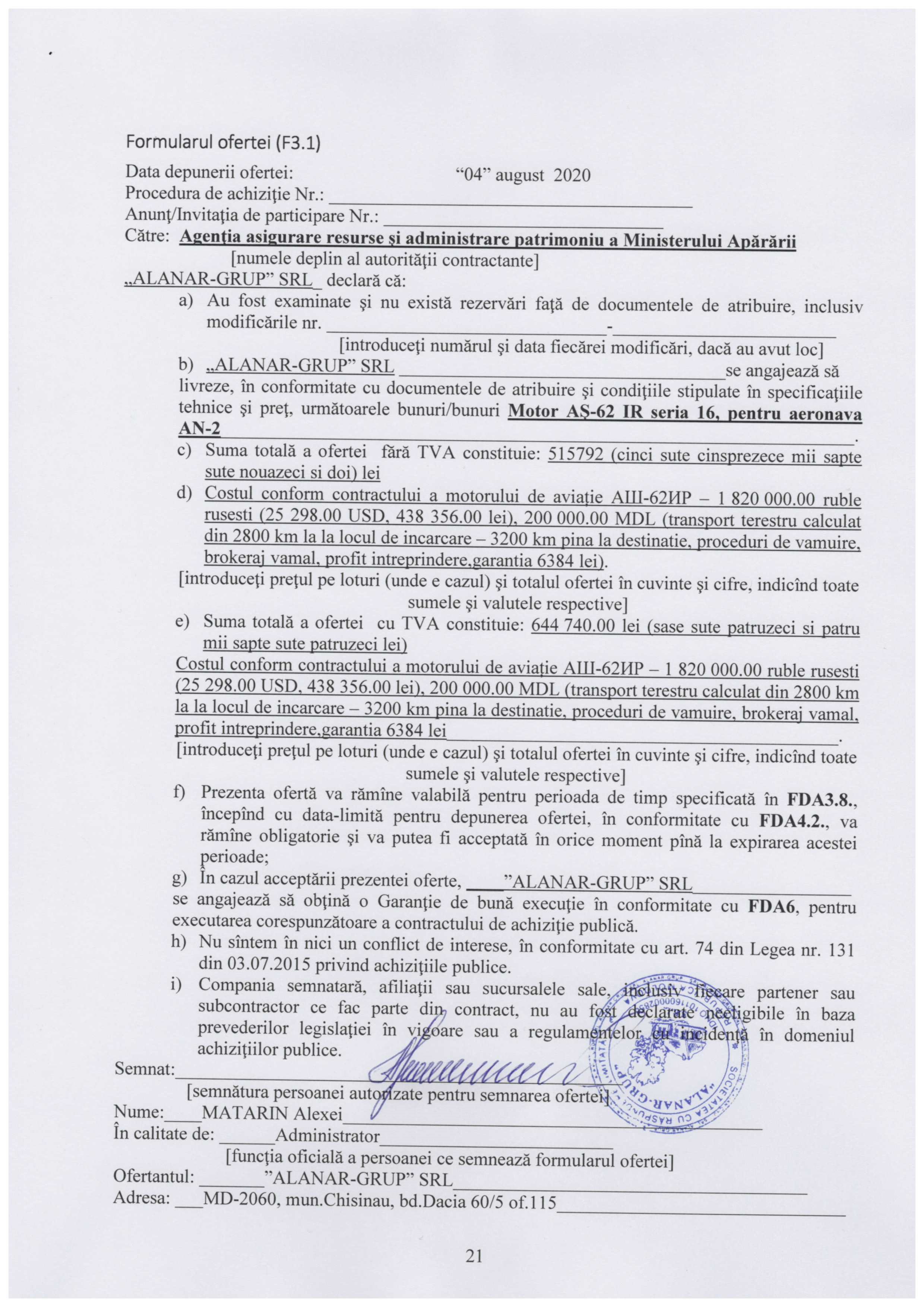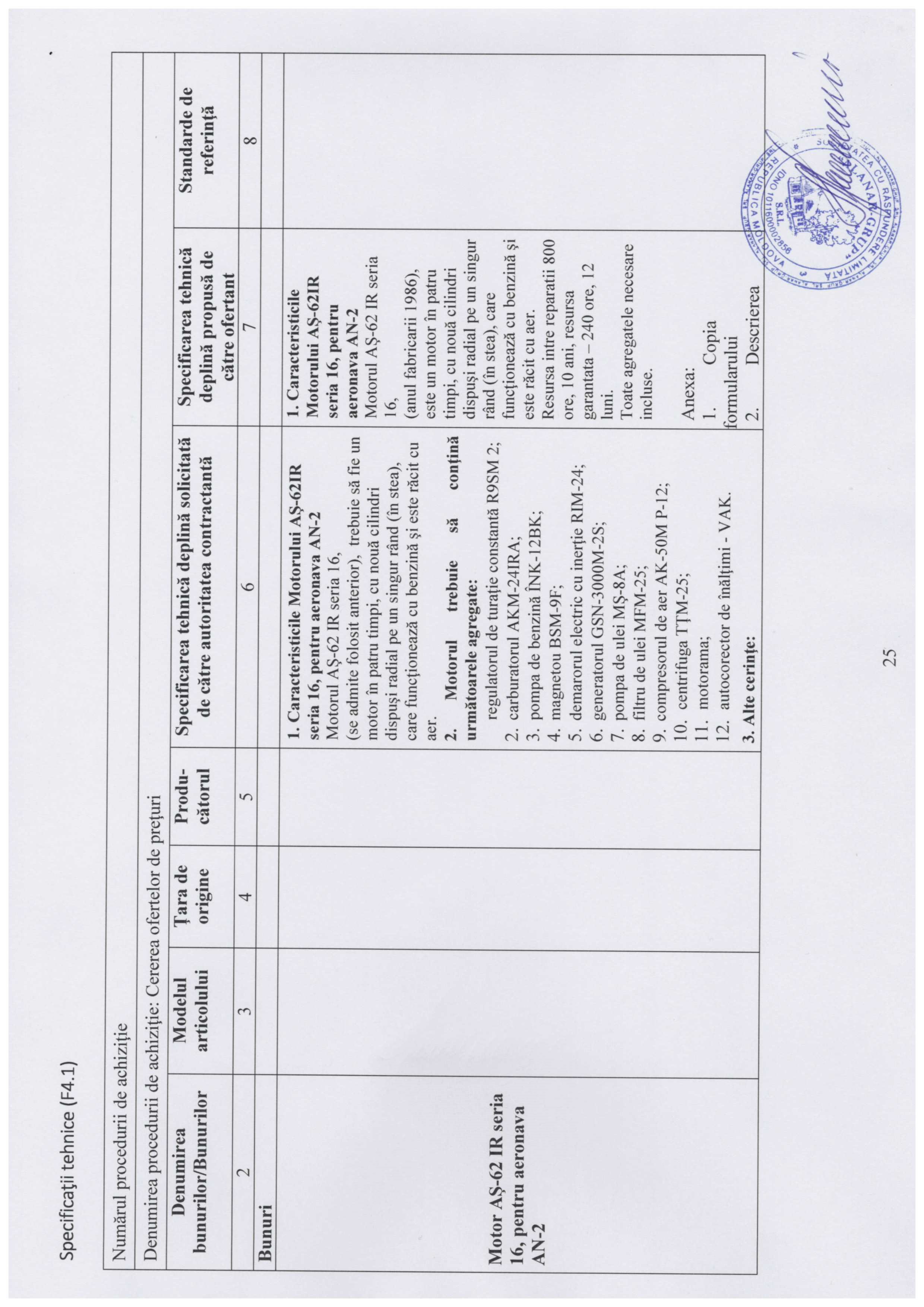 Motor AŞ-62 IR seria 16, pentru aeronava AN-2. 1. Caracteristicile Motorului AŞ-62IR seria 16, pentru aeronava AN-2 Motorul AŞ-62 IR seria 16, (se admite folosit anterior), trebuie să fie un motor în patru timpi, cu nouă cilindri dispuşi radial pe un singur rând (în stea), care funcţionează cu benzină şi este răcit cu aer. Termen de Garanţie – minim 240 de ore de zbor. Resursa de funcţionare a motorului – minim 700 de ore de zbor. 2. Motorul trebuie să conţină următoarele agregate: 1. regulatorul de turaţie constantă R9SM 2; 2. carburatorul AKM-24IRA; 3. pompa de benzină ÎNK-12BK; 4. magnetou BSM-9F; 5. demarorul electric cu inerţie RIM-24; 6. generatorul GSN-3000M-2S; 7. pompa de ulei MŞ-8A; 8. filtru de ulei MFM-25; 9. compresorul de aer AK-50M P-12; 10. centrifuga TŢM-25; 11. motorama; 12. autocorector de înălţimi - VAK. 3. Alte cerinţe: 1. Prezentarea formularului pentru motor; 2. Prezentarea paşaportului tehnic pentru fiecare cilindru; 3. Prezentarea paşaportului tehnic pentru fiecare agregat.