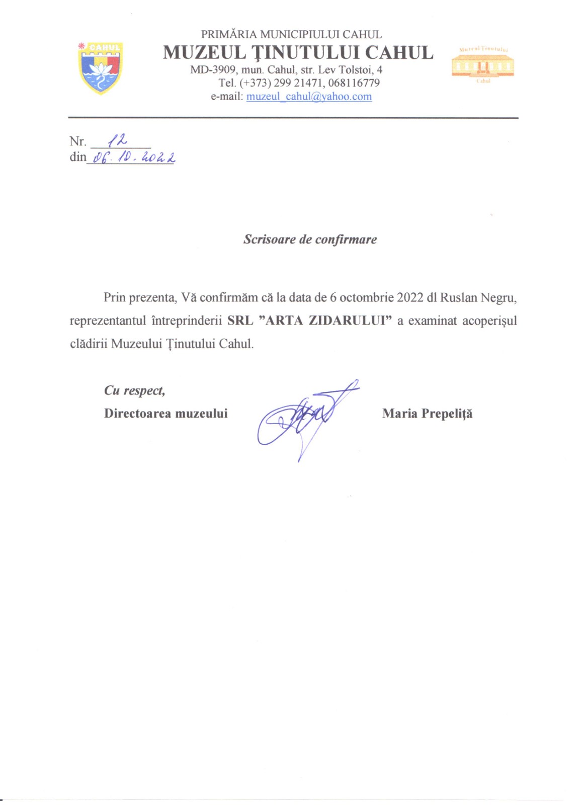 Lucrări de reparație a acoperișului edificiului ”Muzeul Ținutului Cahul” din mun. Cahul, str. L Tolstoi nr. 4